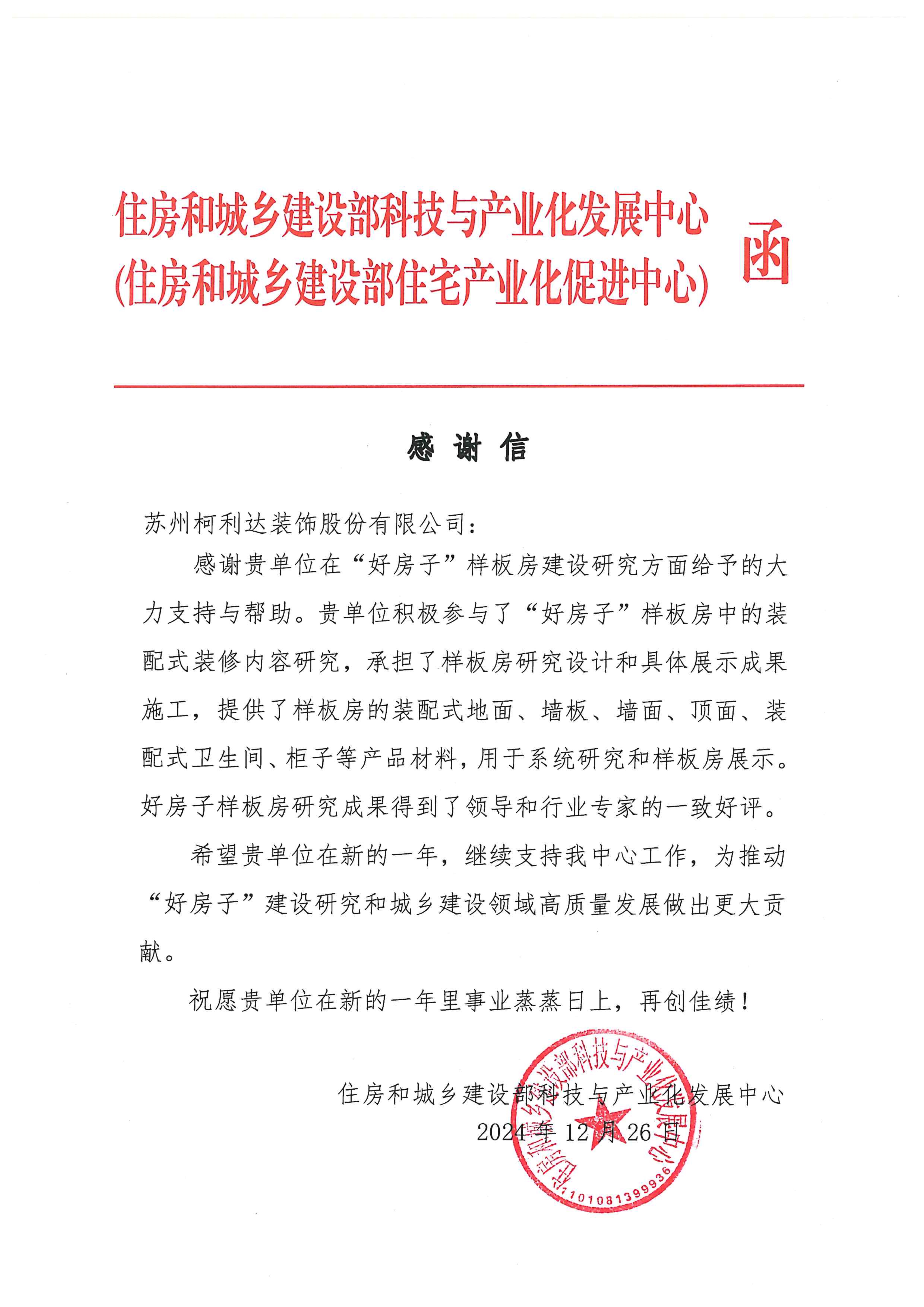 新歲漸近,祥光煥彩。在辭舊迎新之際,柯利達收到來自住房和城鄉(xiāng)建設部科技與產業(yè)化發(fā)展中心發(fā)來的感謝信,對公司在“好房子”樣板房建設研究方面給予的大力支持與